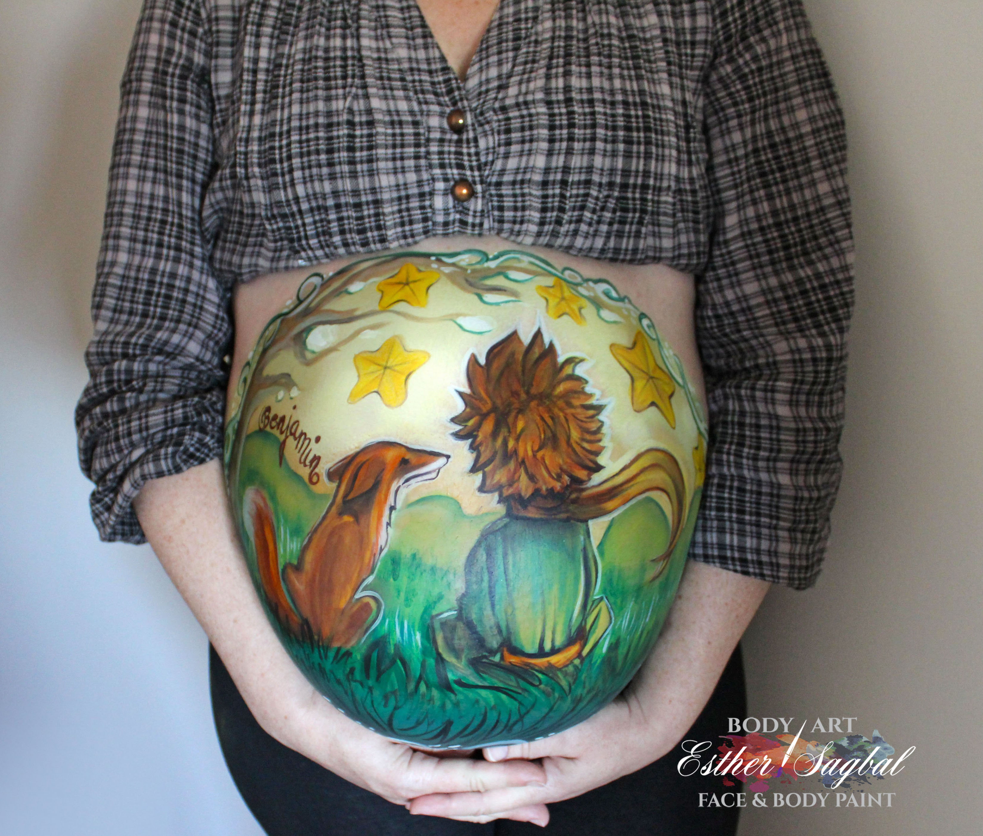 Realizamos una propuesta de 4 diseños diferentes y le recomendamos por su originalidad, dado que no lo hemos visto pintado en ninguna otra barriguita, esta bonita imagen.