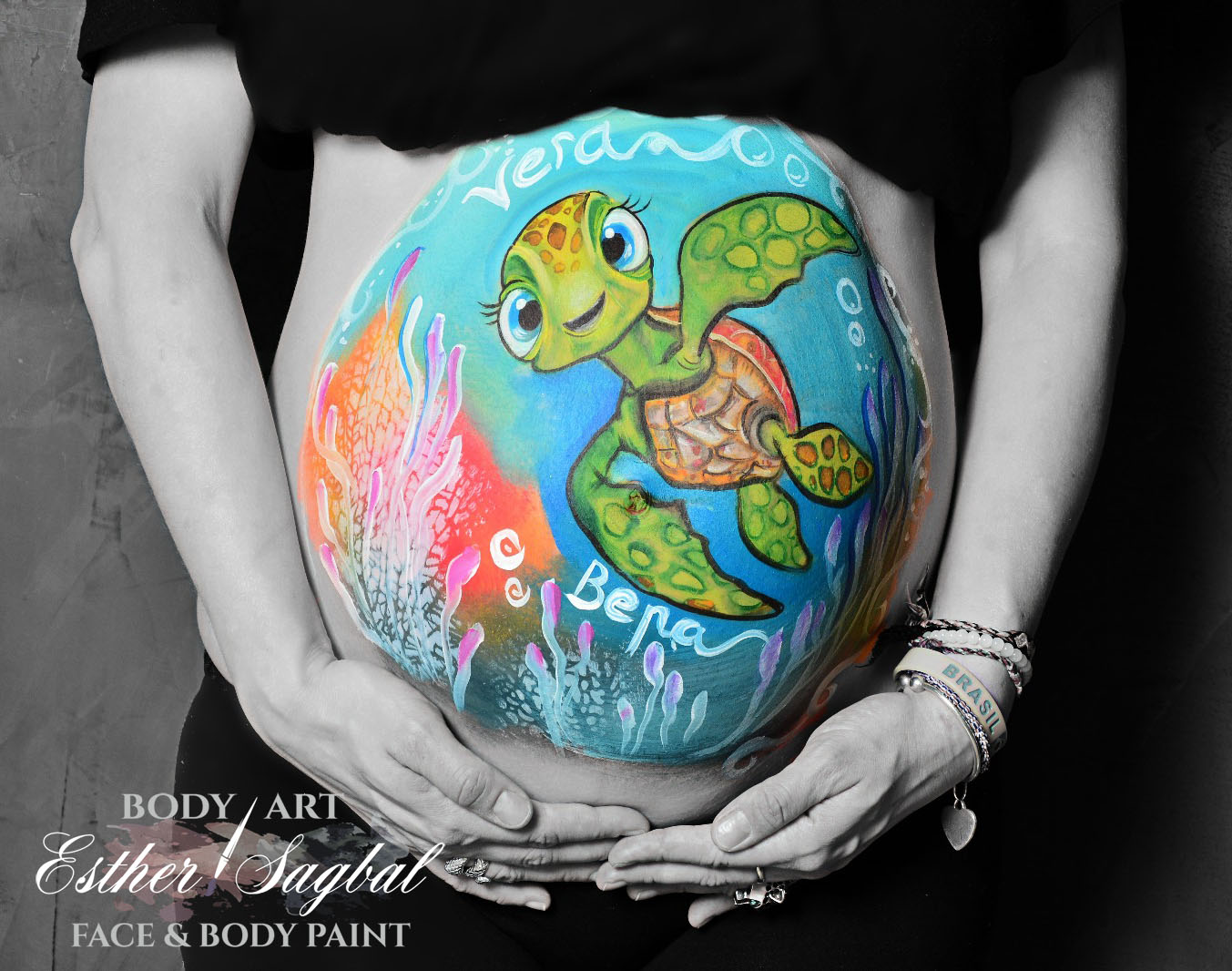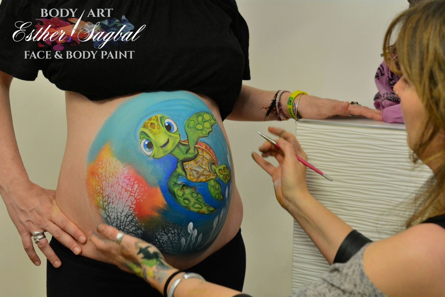 Realizamos nuestra sesión a domicilio con este bonito diseño de bellypaint de tortuguita con fondo marino, donde podemos ver un montón de corales y anémonas.