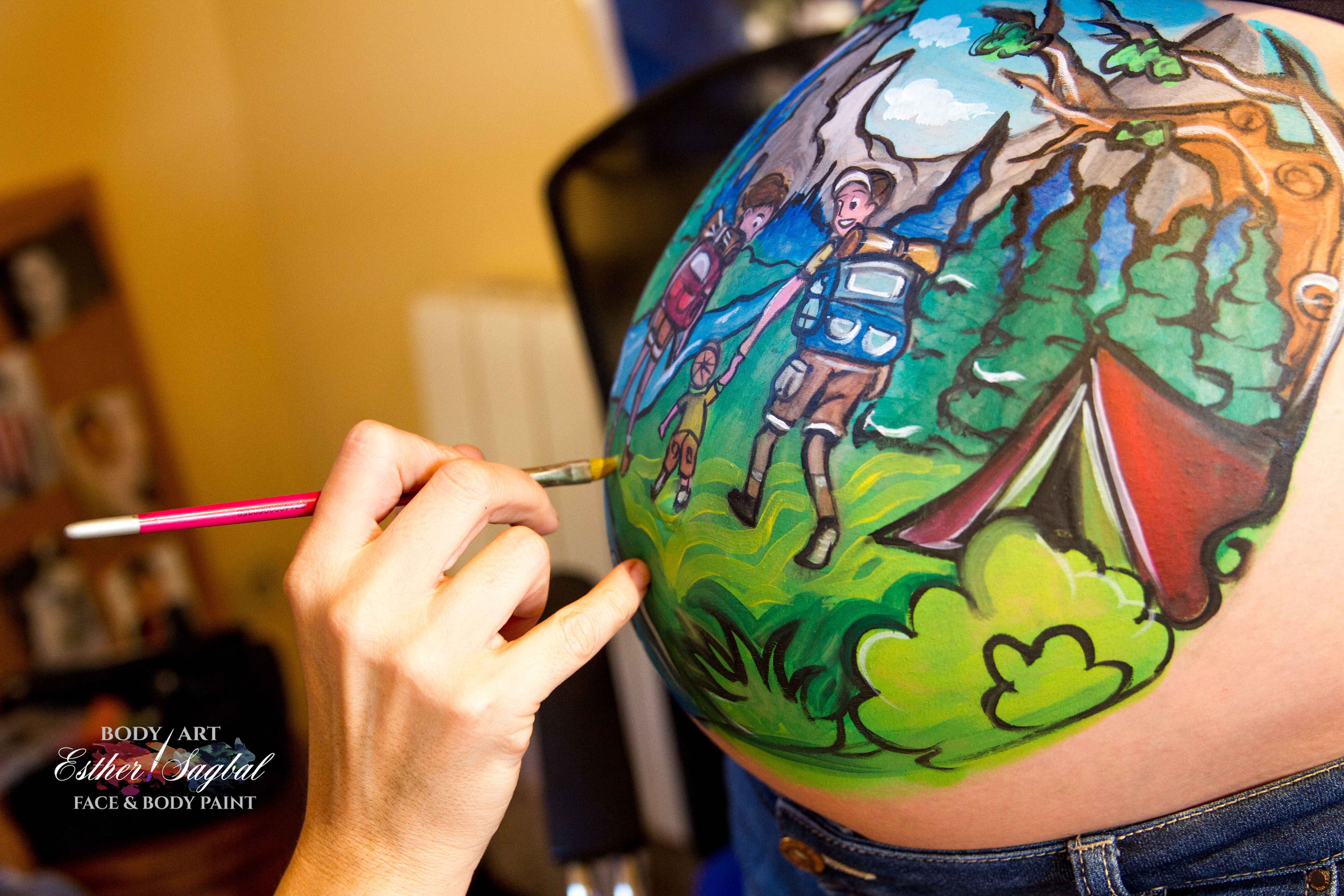 Nuestra bellypainter Esther Sagbal incluyó un precioso paisaje y unos padres senderistas con el niño.