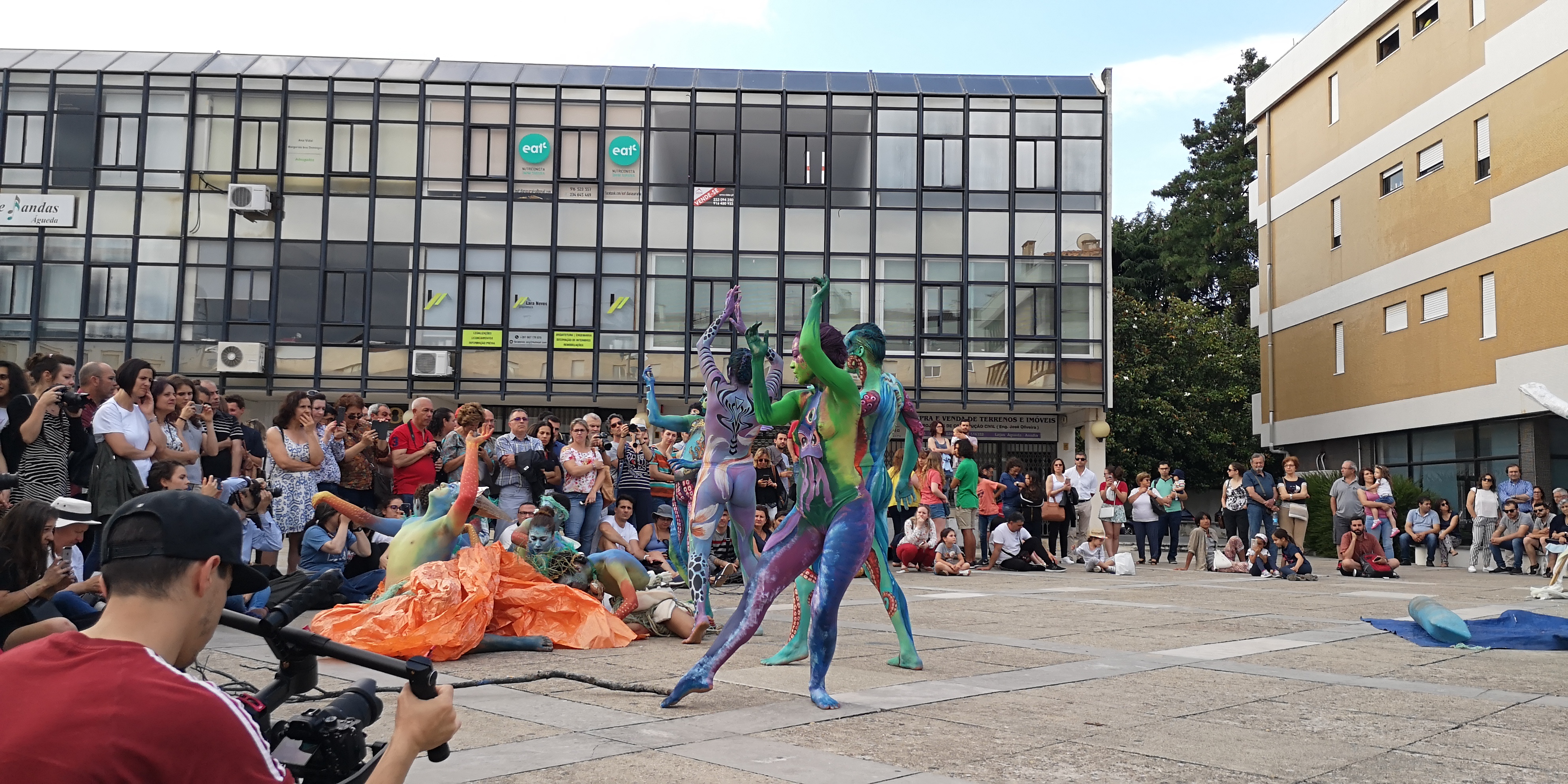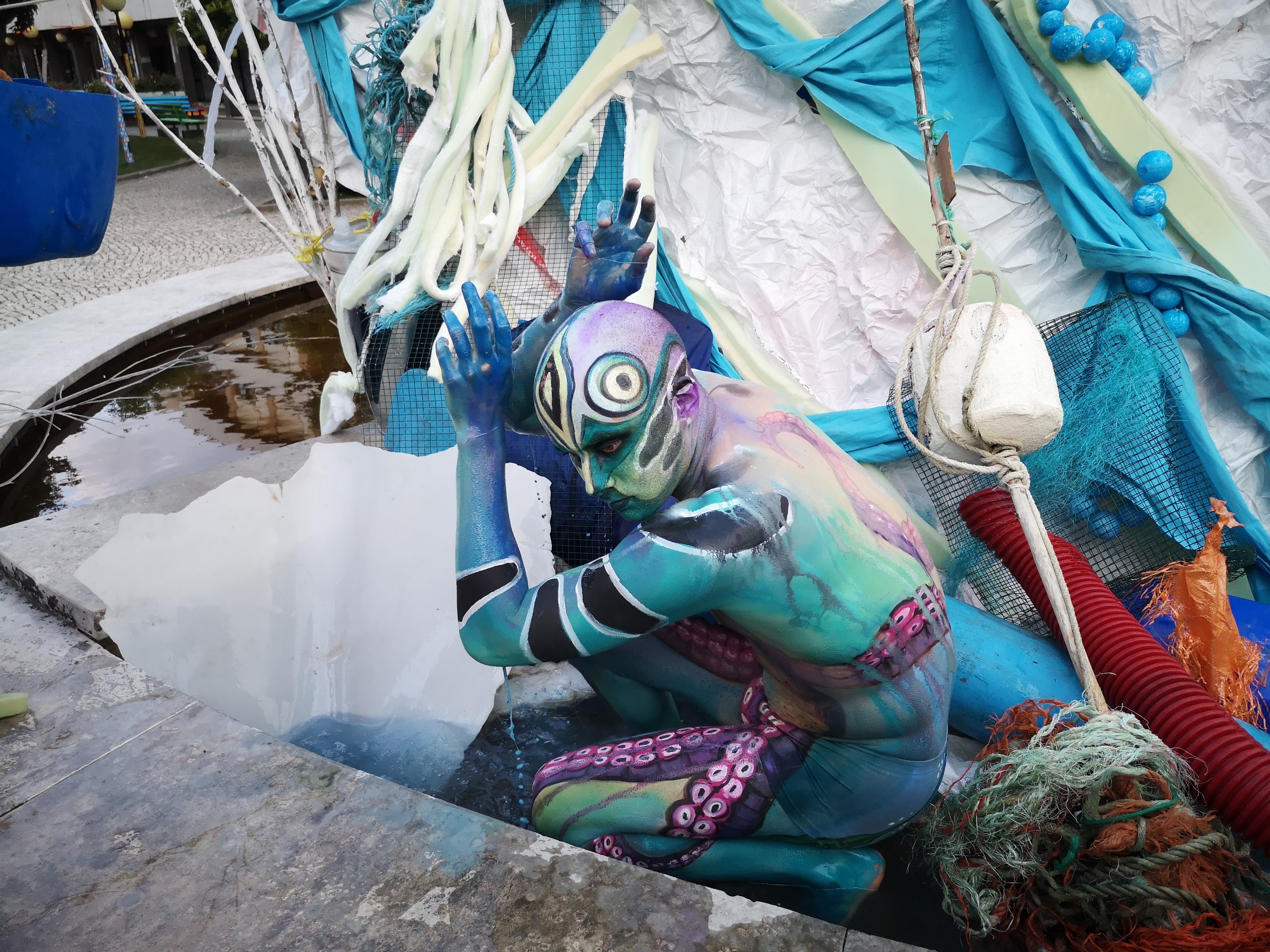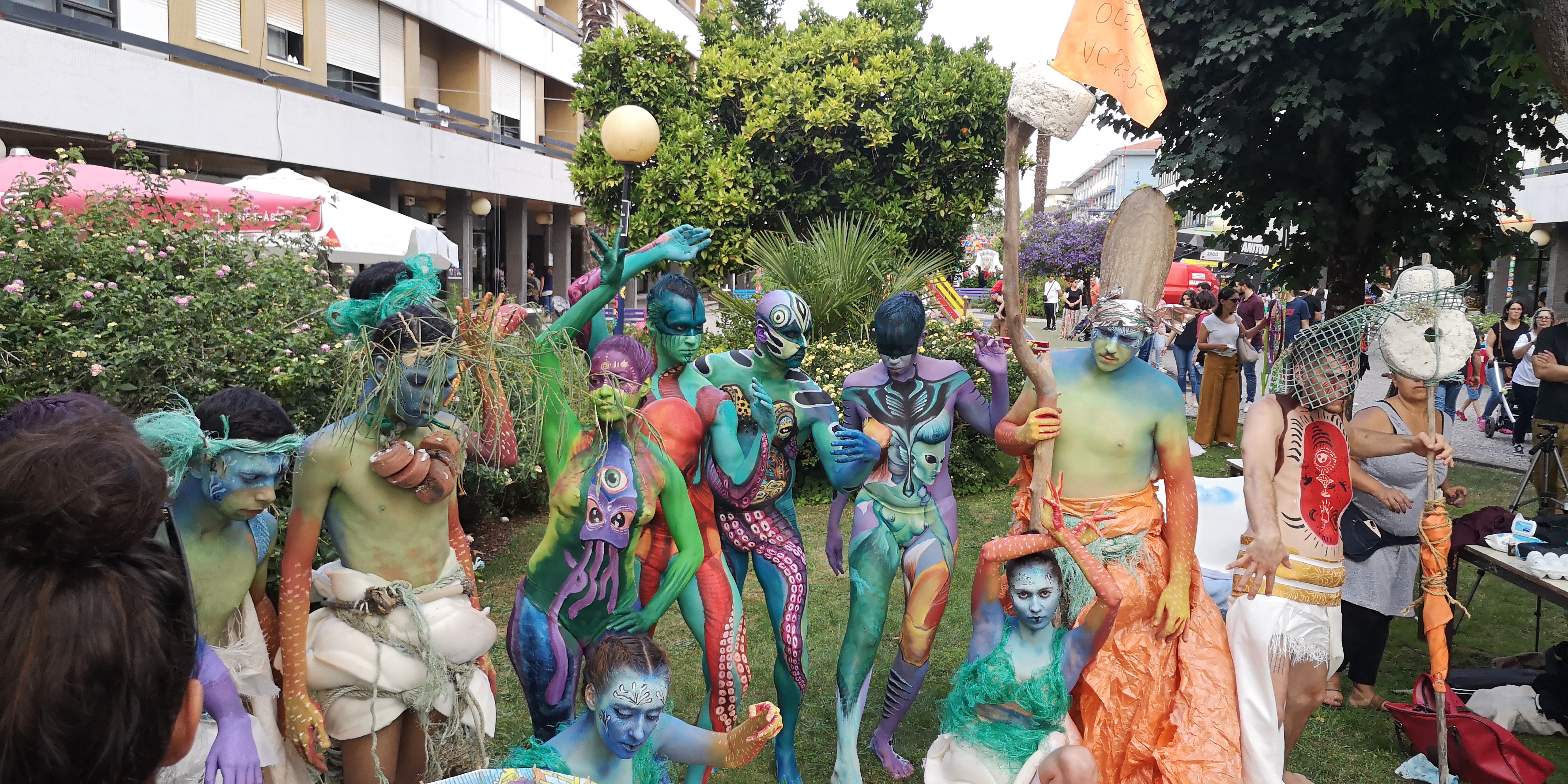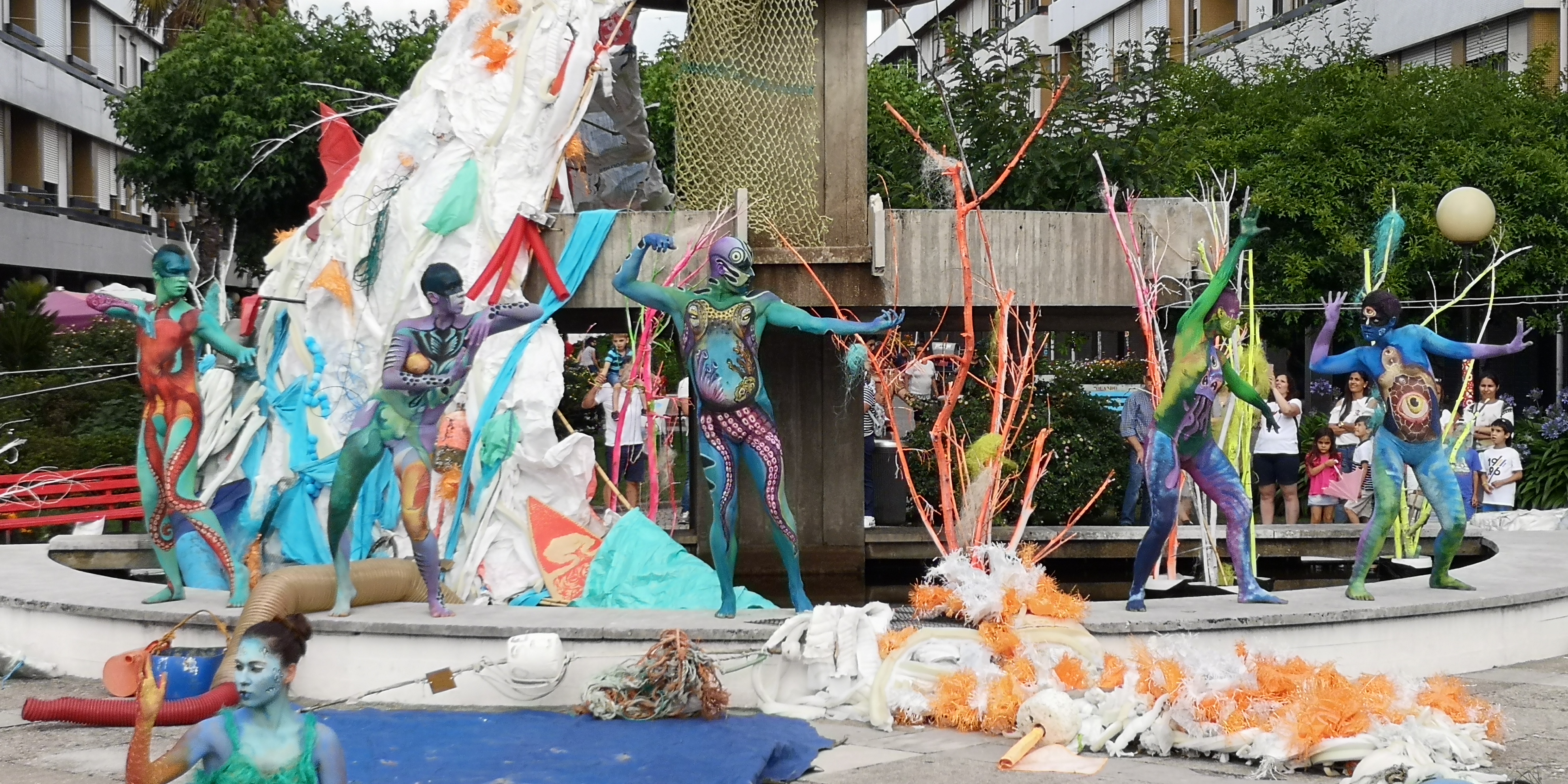 Creamos un performance para la presentación en el festival consistente en la representación de criaturas marinas intentando transmitir al público un mensaje para animar al cuidado de los océanos.