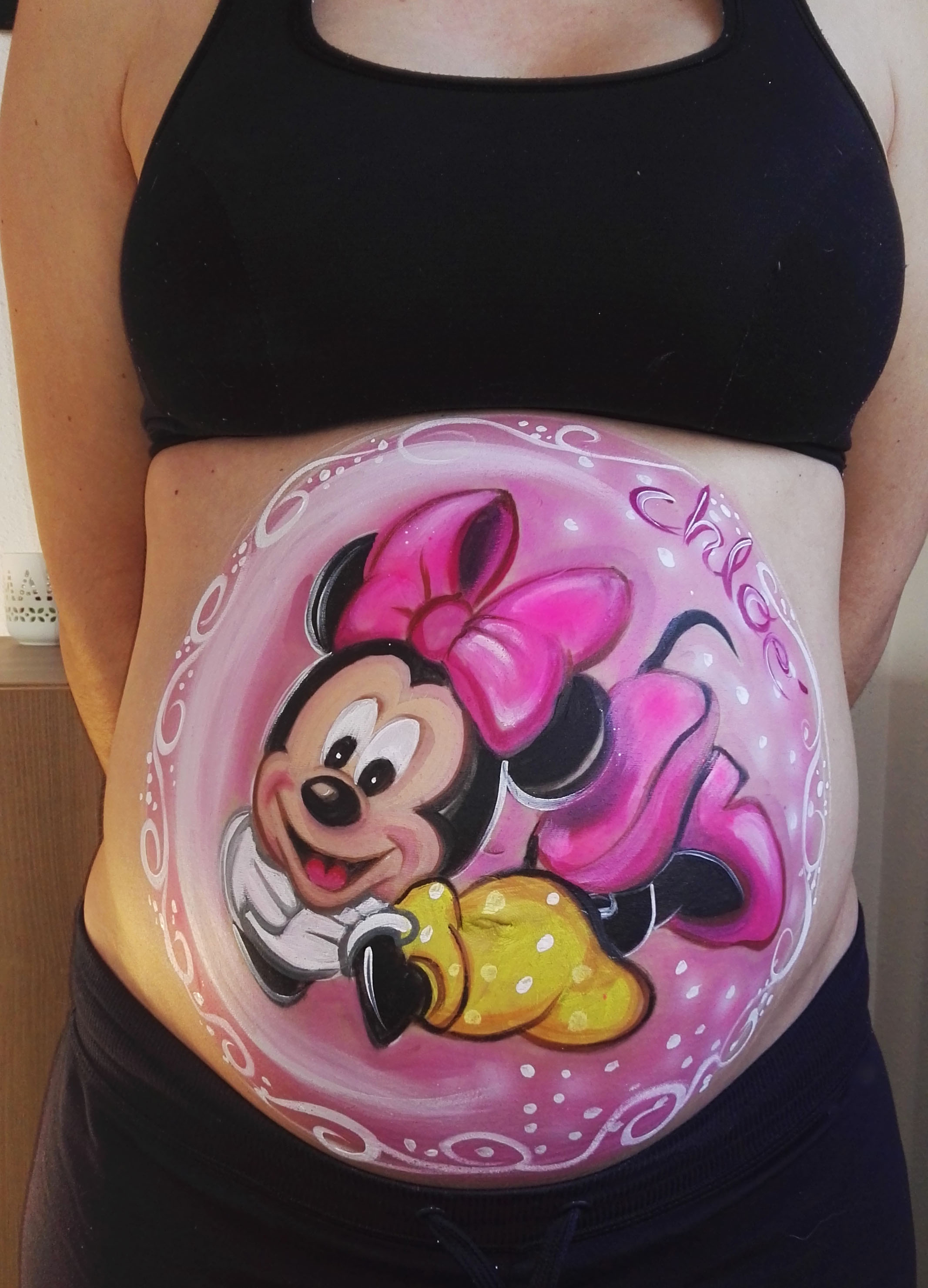 Realizamos nuestra sesión de bellypaint a domicilio con este bonito diseño de bellypaint de Minie Mouse con este bonito resultado.