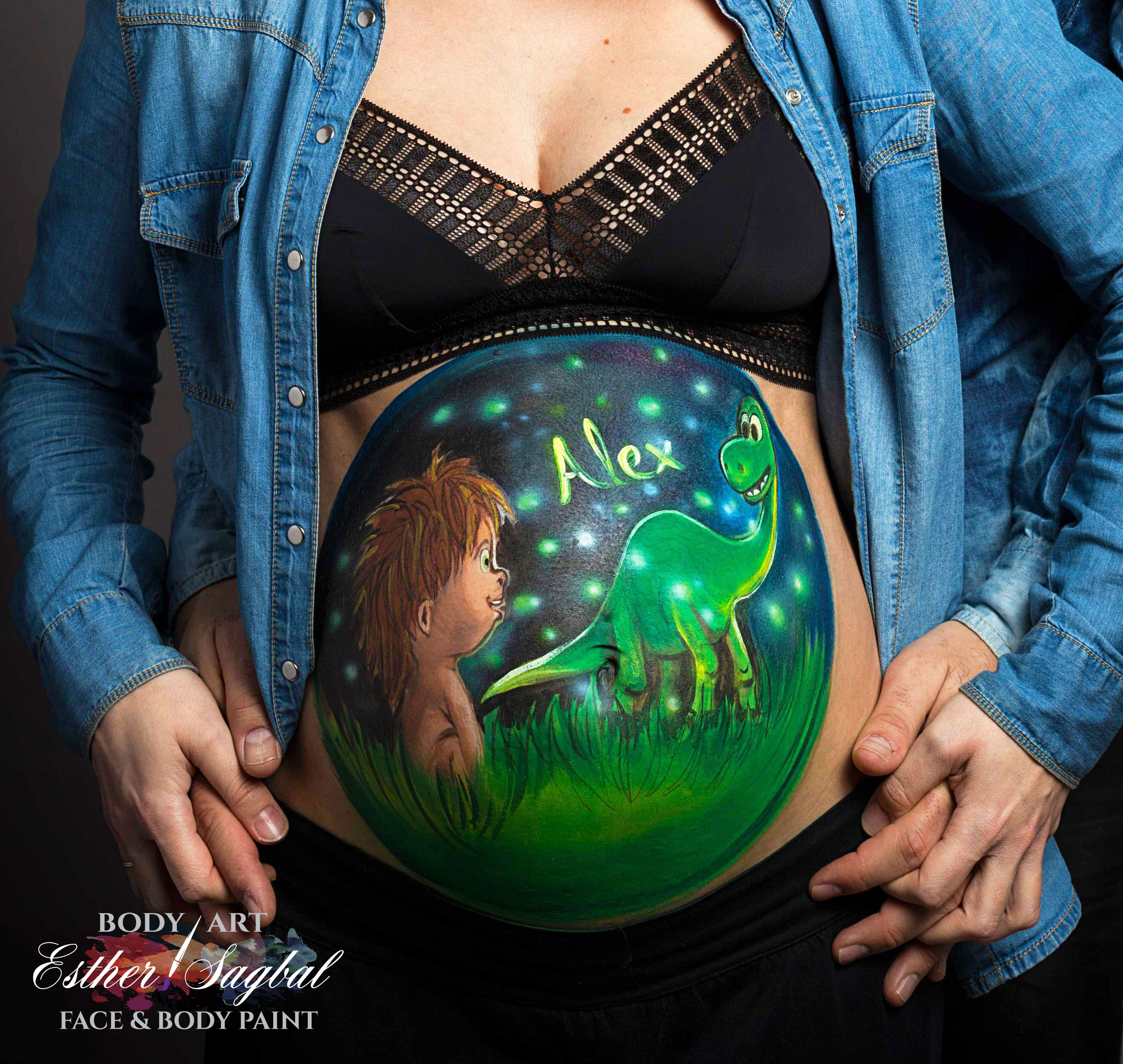 Esta vez los futuros padres eligieron un bellypaint de la escena de la película “EL viaje de Arlo” :