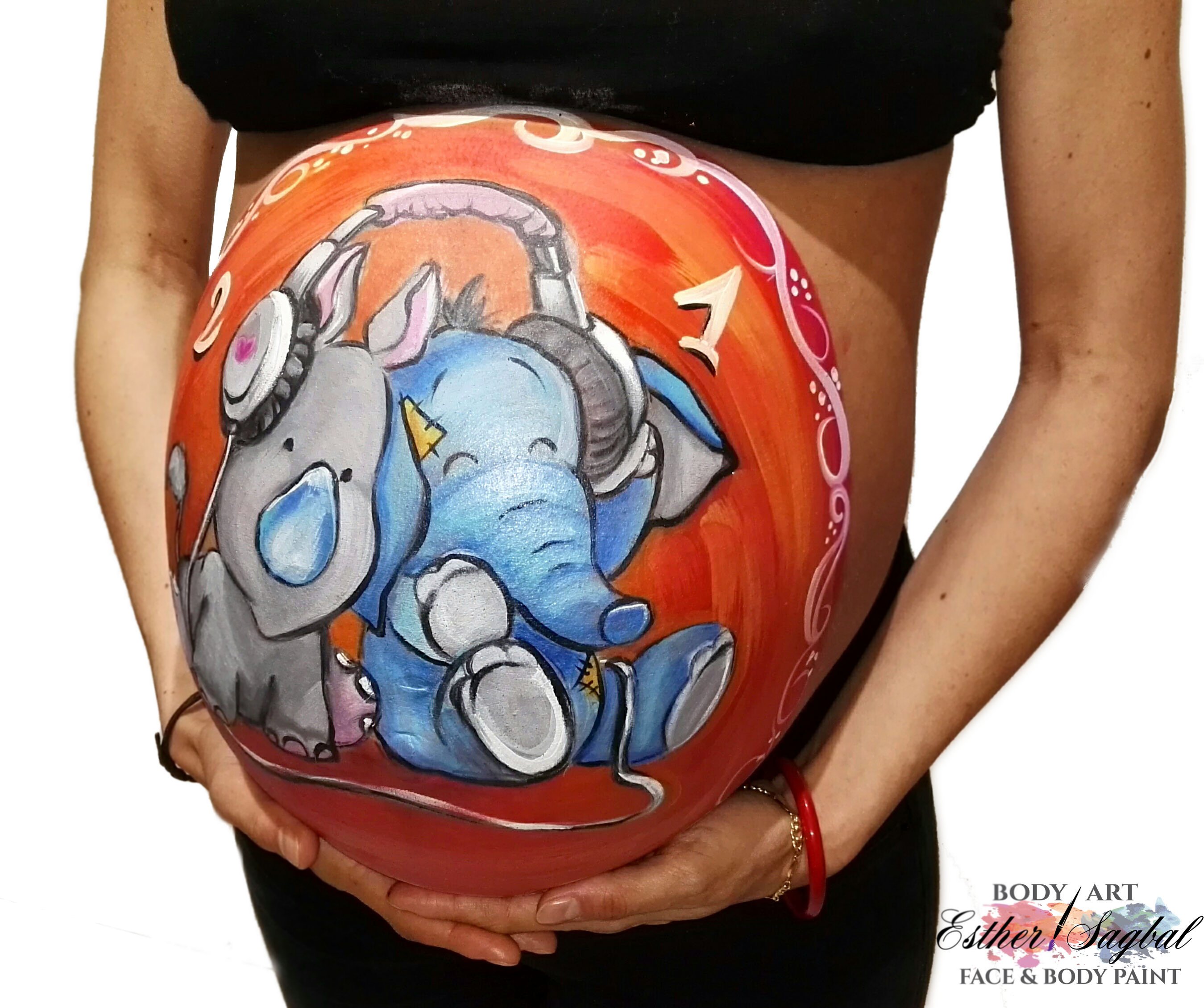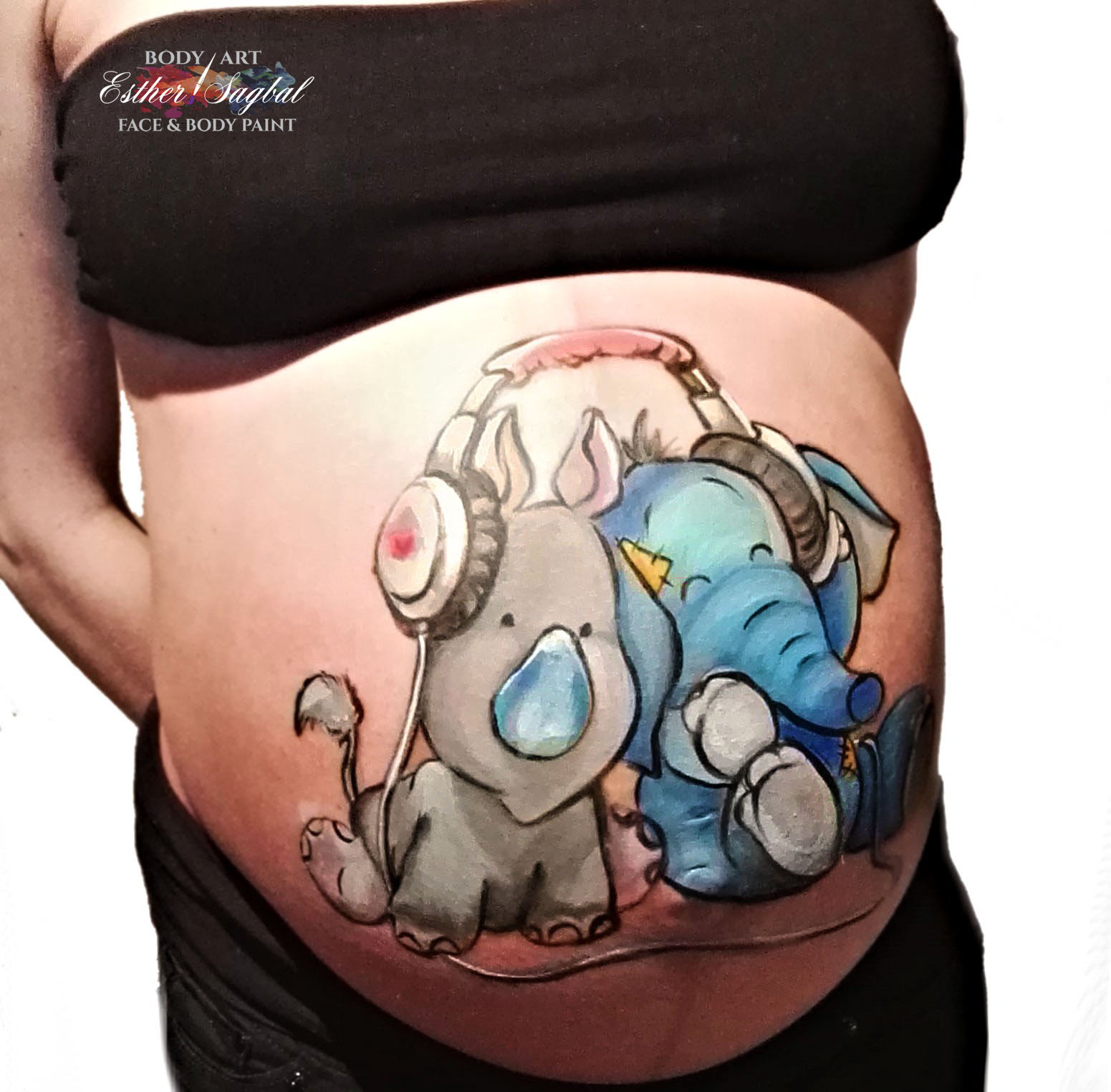 Esta vez los futuros padres eligieron un bellypaint con una simpática imagen de un elefantito y un rino bebé para representar a sus dos gemelos.